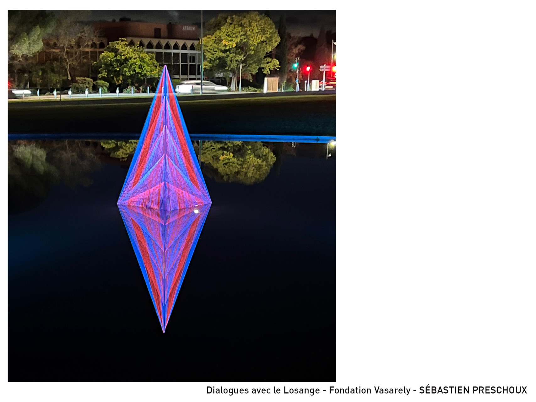Dans la salle 8, Sébastien Preschoux expose un premier mobile filaire tissé de lignes tendues et d’ombres mouvantes. En dialogue direct avec les compositions de Vasarely, cette structure aérienne prolonge la figure du losange dans la troisième dimension. Un second mobile se reflète sur le bassin-miroir, où l’eau démultiplie la forme par reflets mouvants. Par ce jeu de reflets, l’œuvre révèle l’ambiguïté vasarélienne entre forme réelle et image reflétée, faisant de la perception une expérience en perpétuelle transformation.