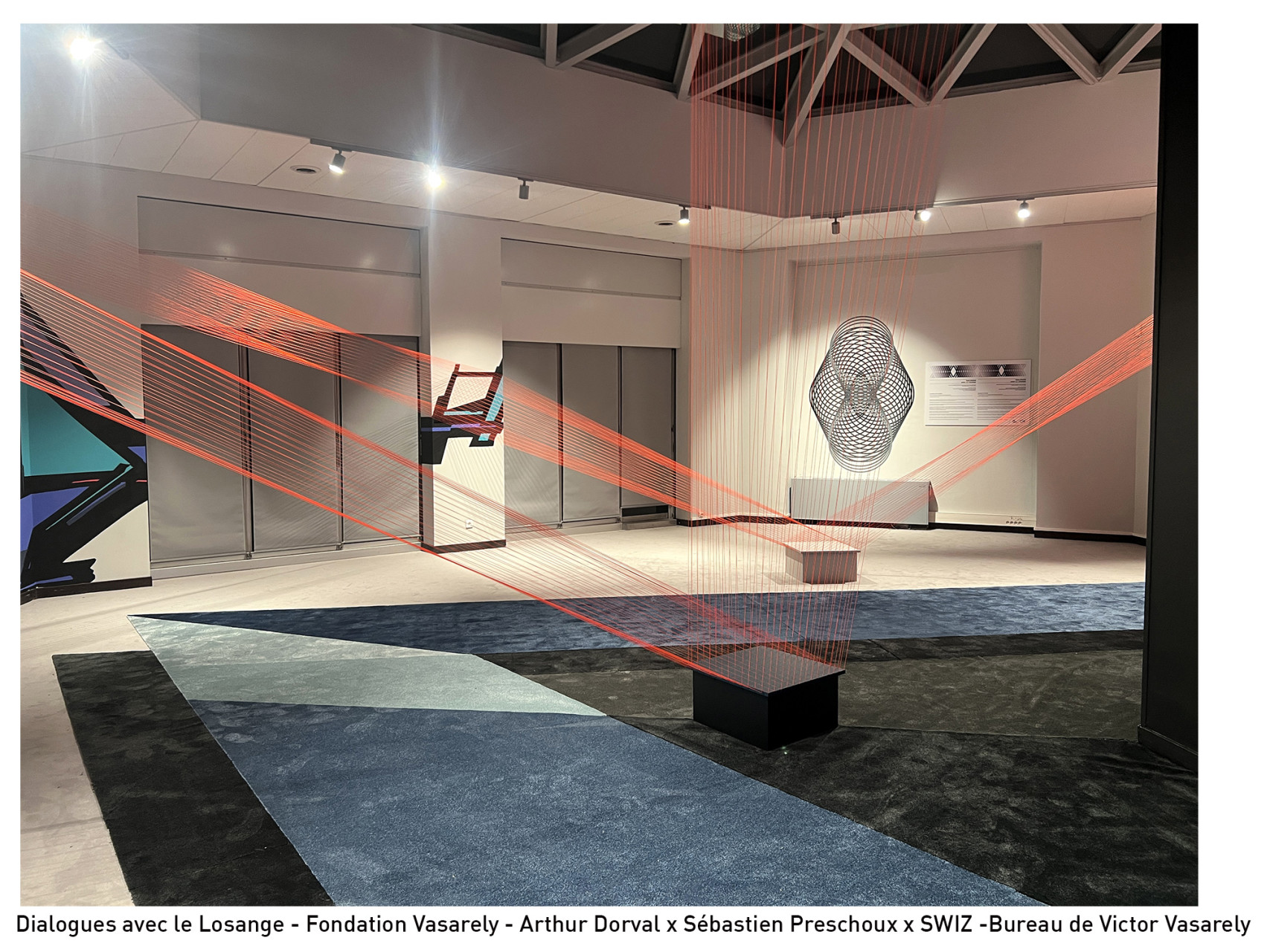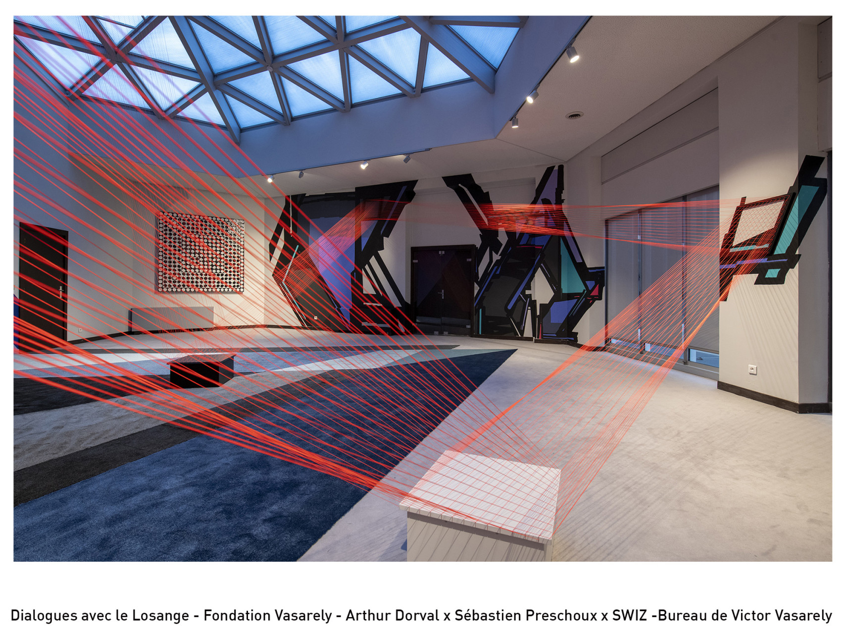 En résonance avec cette œuvre, les trois artistes transforment le bureau en une déambulation kaléidoscopique où géométries architecturées, installations filaires et abstractions chromatiques composent un environnement vibrant.